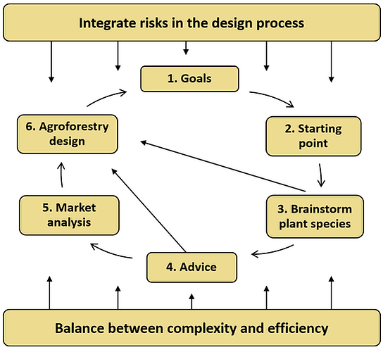 This figure shows how to design an agroforestry system. Two important principles to be aware of during the design process are (1) risk-management and (2) a balance between complexity and efficiency. The aim of this “design-framework” is to help you design a profitable, biodiverse, and practically viable agroforestry system.