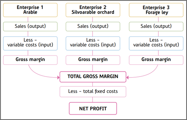 Figure 34 from UKs agroforestry handbook, written by Ian Knight, shows how to budget the gross margin of different enterprises and the net profit in agroforestry.