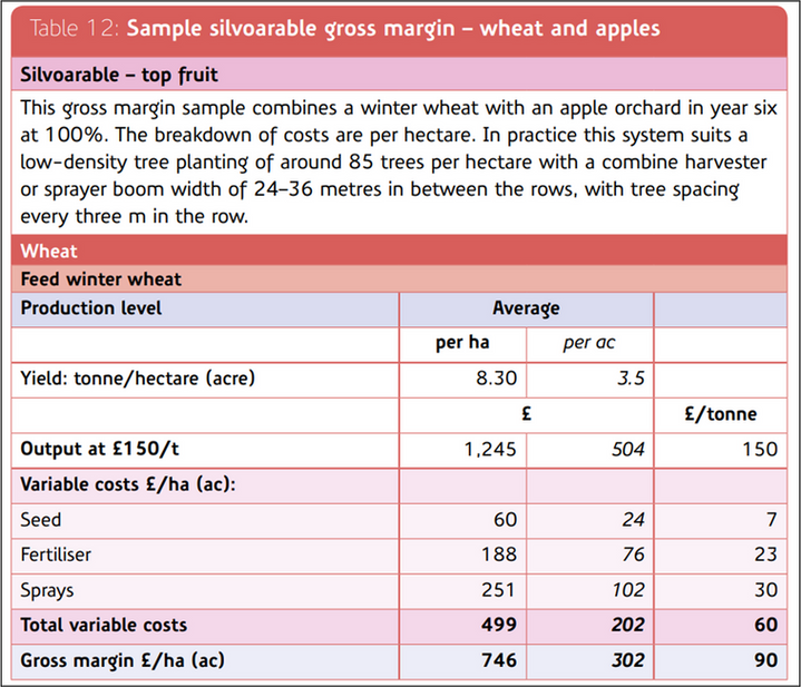 Table 12 from UKs agroforestry handbook, written by Stephen Briggs, showing the financial calculations of an apple-winter wheat alley cropping system in year 6, 100% production.